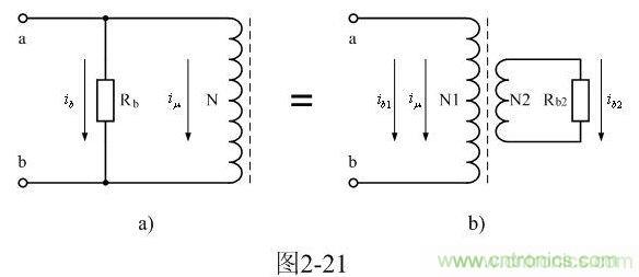 圖2-21-a中,Rb為渦流損耗等效電阻,N為變壓器初級線圈。由此可以看處,由于受渦流損耗的影響,變壓器鐵芯被磁化時,相當(dāng)于一個渦流損耗等效電阻Rb與變壓器初級線圈N并聯(lián)。