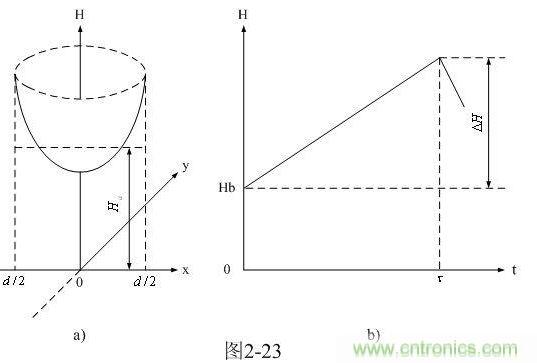 圖2-23-a和圖2-23-b是圓柱形變壓器鐵芯中磁場強度按水平方向分布的函數(shù)H(x,y)曲面圖和按時間分布的函數(shù)H(t)曲線圖。