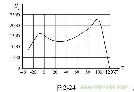順便說明,圖2-24中的初始導(dǎo)磁率 一般是用磁環(huán)作為樣品測試得到的,測試信號的頻率一般比較低,僅為10kHz,并且測試時一般都選用最大導(dǎo)磁率作為結(jié)果;因此,實際應(yīng)用中的開關(guān)變壓器鐵芯的導(dǎo)磁率并沒有這么高。