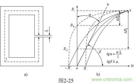 在圖2-25-a中,假設(shè)L1為氣隙長度,變壓器鐵芯磁路的總長度為Lc,則磁路的磁通勢為: