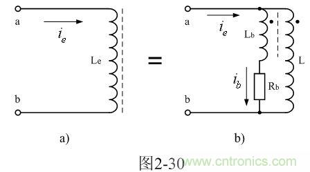 圖2-30-a中,Le是一個(gè)同時(shí)考慮渦流損耗因素的電感;L是變壓器原初級(jí)線圈的電感;Rb是鐵芯渦流損耗電阻;Lb是一個(gè)互感線圈,通過(guò)它把流過(guò)電阻Rb的電流感應(yīng)到變壓器初級(jí)線圈中;當(dāng)流過(guò)電阻Rb的電流增加時(shí),流過(guò)通過(guò)Lb互感線圈的感應(yīng)作用,使流過(guò)變壓器初級(jí)線圈L的電流也同時(shí)增加。