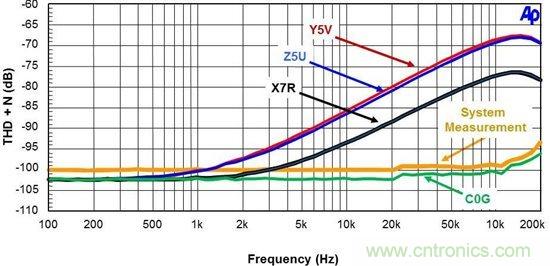 圖 3. 電容器 THD+N 與頻率的關系
