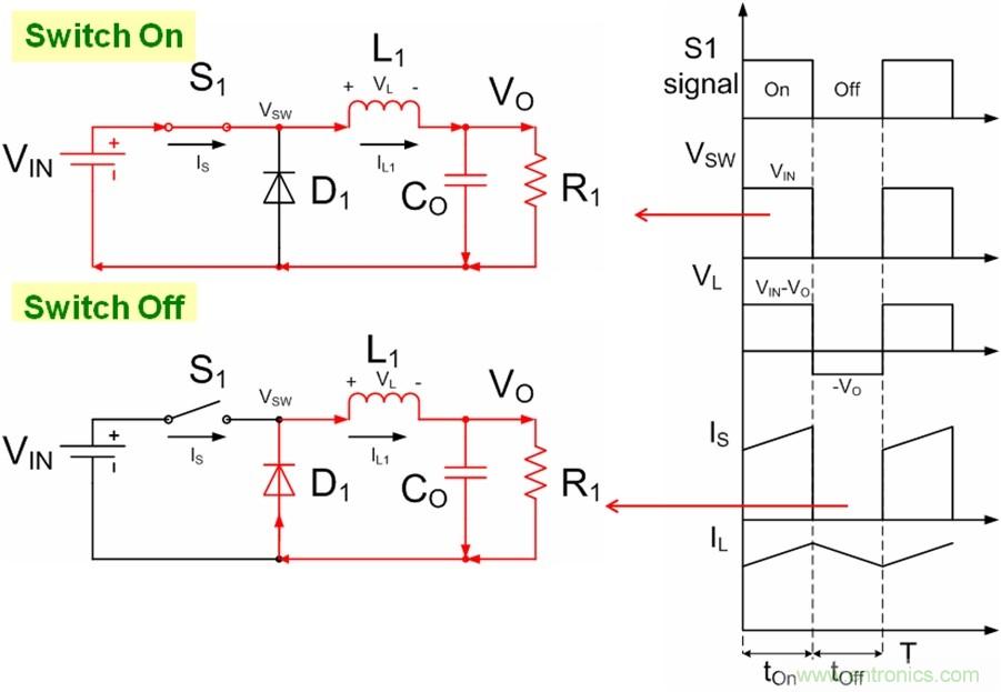圖2. 電流連續(xù)模式下的非同步buck的工作原理