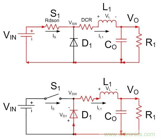 88%只是理想情況下的理論計算值。實際中,需要考慮續(xù)流二極管D1的壓降,開關管S1的導通壓降,以及電感L1的直流阻抗的壓降,如圖3所示。