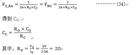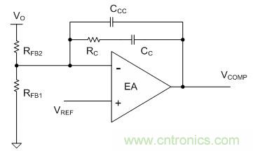 因為電路采取用瓷片電容,所以不用去消除由ESR造成的零點。CCC 不接。 如果采用的是電解電容則需要把反饋電路的極點放到主電路ESR零點附近??筛鶕?jù)下式計算CCC