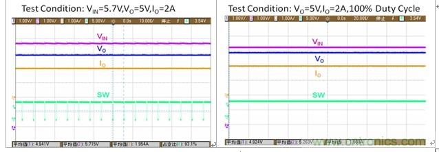 取VIN=5.7V,VO=5V,IO=2A,VD=0.3V, Rdson=50m?, DCR=70m?, 可以計算所需要的占空比為:![]()