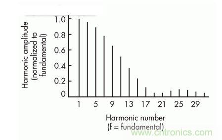 非線(xiàn)性負(fù)載可使諧波大小與線(xiàn)路頻率下的基本諧波電流具有可比性。圖4顯示了相對(duì)于線(xiàn)路頻率下的基本諧波大小進(jìn)行標(biāo)準(zhǔn)化的高階諧波電流大小。不過(guò),只有圖1中給出的在與線(xiàn)路頻率相同的頻率下且與電源線(xiàn)電壓同相的諧波電流(在此案例中為線(xiàn)路頻率下的基本諧波)對(duì)提供給負(fù)載的平均功率起作用。這些諧波電流會(huì)影響同一電力線(xiàn)上的其他設(shè)備的工作情況。