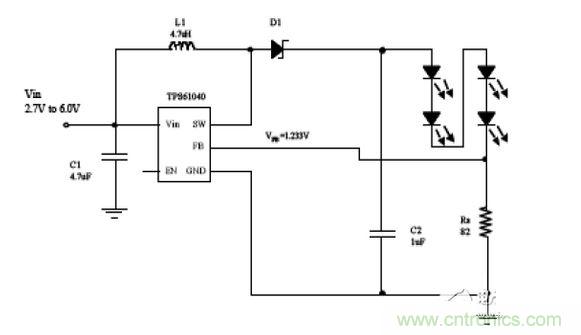 圖 中的升壓轉(zhuǎn)換器被配置為一個(gè)可驅(qū)動(dòng) 4白光 LED 的電流源。該器件將檢測(cè)電阻器 Rs 兩端的電壓調(diào)節(jié)至 1.233V,從而得到一個(gè)定義的 LED 電流。