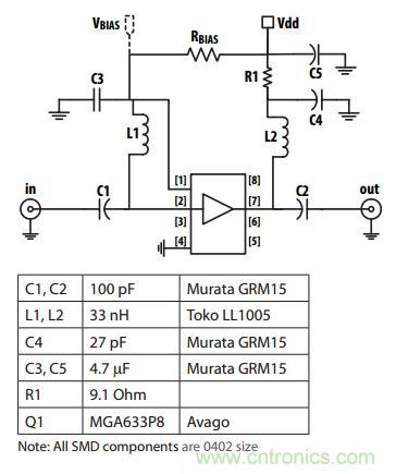 圖:MMIC本身由一個單個的FET共源放大器和一個動態(tài)偏壓調(diào)制器組成