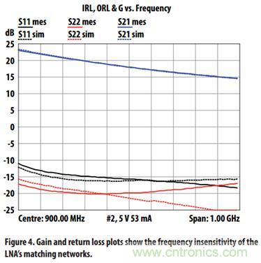 在900MHz,低噪放的噪聲大約為0.3dB,增益大約為18dB,輸入和輸出回波損耗為小于-15dB。另外,在1GHz的帶寬內(nèi),回波損耗都可以滿足 這個要求。從系統(tǒng)的角度來說,這個是非常受歡迎的特性。主要是由于傳統(tǒng)的基站需要靠隔離器或者3dB耦合器來滿足系統(tǒng)回波損耗的要求。進(jìn)一步來說,輸入輸 出匹配的寬帶寬也使得基站的雙工器或者輸入輸出濾波器的使用調(diào)試變得簡單,降低了系統(tǒng)的設(shè)計復(fù)雜度。