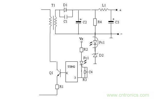 經(jīng)檢查此開關電源采用U3842 PWM控制芯片,經(jīng)查找相關的資料得知,當U3842芯片的3端電壓高于1伏時,內(nèi)部電流敏感比較器輸出高電平,將PWM鎖存器復位使輸出關閉。通電測量U3842的3端高于1伏,6端無輸出,經(jīng)檢查相關電路,發(fā)現(xiàn)穩(wěn)壓管D2擊穿,如圖3,故PC1導通,致使U3842的3端為高電平,故6端無輸出,開關管不工作,直流側(cè)無直流輸出。更換同型號穩(wěn)壓管D2,故障解除。
