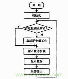 單片機在初始化程序中完成對單片機、SA4828以及其他可編程器件的初始化,接著對市電進行檢測,如果市電不正常,則啟動逆變器工作,通過控制將開關(guān)元件切換至逆變器輸出。并將輸入狀態(tài)存入控制寄存器,顯示數(shù)據(jù),如果輸出電壓或保護等發(fā)生改變,則報警輸出以采取措施使系統(tǒng)正常運行。