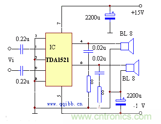 TDA1521是一款雙聲道音頻功率放大集成電路,9腳單列直插式封裝,輸出功率2×15w。性能穩(wěn)定,音質(zhì)也不錯,在音響應(yīng)用中較為常見。 TDA1521可以在單電源或雙電源模式下工作,工作電源電壓范圍15V~40V(±7.5 -- ±20V),以下是TDA1521單電源接法和雙電源接法的電路圖: