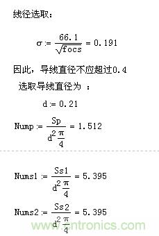 對于一定的電流,需要的導(dǎo)線截面積是一定的,在實際選取線徑的時候,要結(jié)合實際所選的骨架幾何尺寸,做合適的組合,盡量不要散繞,對于某一層繞組,單根線太散的話,可以選取兩根或者幾根細線進行并饒,只要繞組的總截面積在計算值左右就好。