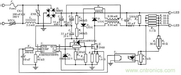 驅(qū)動電路原理圖如圖1所示,通過橋式整流器,電流直接被送到LED負載的正極,然后通過負極,經(jīng)由變壓器到達晶體管Q1,最后又通過橋式整流器,這就是該負載電路電流的主要回路。當沒有負載時,R17就充當保護電路的負載,保證電路不會短路。C1在這里起到濾波以及平衡負載兩端電壓的作用。D1為蓄流二極管,保證變壓器正常工作。電路圖的下半部分,是由兩個芯片和Q1組成的反饋調(diào)節(jié)電路。Q1能根據(jù)U1的變化情況,向變壓器發(fā)出高頻電流。當負載電流過載時,電流會通過R7和R8到達U2,使得U2右邊的二極管發(fā)熱,導致U2左邊的電壓降低,同時反饋到U1,U1通過調(diào)節(jié)電壓和頻率控制電路,從而使系統(tǒng)電路輸出恒定電流。