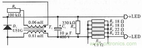 如圖2所示,此電路通過變壓器輸出適當?shù)碾娏?,當有LED負載時,電路中通入適當?shù)碾娏骱皖l率使LED正常工作;當沒有負載時,變壓器中仍然殘留有能量,需要釋放。此時由R17等構(gòu)成的回路,可以慢慢地釋放變壓器中的電能。但當電流突然減小時,變壓器中會產(chǎn)生感應電動勢,由此會產(chǎn)生較高的反向電壓,可能會擊穿器件。為了克服這個問題,在線圈的兩端并聯(lián)一個續(xù)流二極管D1,同時在電路輸出端串聯(lián)R15,并且在R15兩端并聯(lián)R2,R3,R4,R6。R15有降壓作用,并且能為反饋電路提供電壓。由于R15承受的功率較大,容易燒壞,所以預備一個由R2,R3,R4和R6的并聯(lián)等效電阻,這樣每個電阻承受的功率變小,在增加使用壽命的同時,能夠減少維修費用。