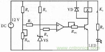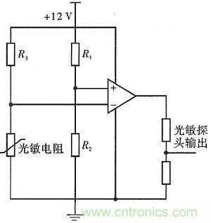 其由光電轉(zhuǎn)換模塊和光敏電阻組成。光電轉(zhuǎn)換由比較器來實現(xiàn)。當光敏探頭感應的光照強度不強時,比較器會輸出高電位,否則輸出低電位。具體電路如圖6所示。R1分擔電路電壓,依照外界環(huán)境條件,選擇適當?shù)碾娮鑂2,控制比較器中正相輸入的電壓值,使其作為比較器工作的參考電壓;R3起到保護光敏電阻以及分壓的作用。光敏電阻的阻值隨著外界光強的變化而變化,這樣就可將光信號變換成電壓信號,以此作為信號電壓連接到比較器的反相輸入端。比較兩個輸入端的電壓大小。若信號電壓較小,比較器輸出高電平,否則比較器輸出低電平。從而實現(xiàn)在明亮條件下輸出低電平,在黑暗條件下輸出高電平的設(shè)計要求。