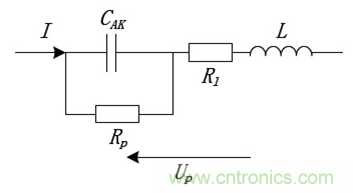 根據(jù)鋁電解電容的物理結(jié)構(gòu),可以用圖 1中所示的電路等效,其中CAK代表兩電極間的理想電容量;Rp 是并聯(lián)電阻,代表了電容的漏電流成分;Rl 代表了電容引出端及電極部分的串聯(lián)電阻成分;L 代表了引出線和連接處的等效串聯(lián)電感成分。