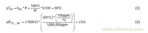 公式3可計(jì)算功率耗散所引起的電阻器溫度增加量ΔTSH。公式4將ΔTSH插入公式1替代ΔT,以確定100°C/W適度自發(fā)熱和0.5W功率耗散情況下自發(fā)熱所引起的電阻變化。