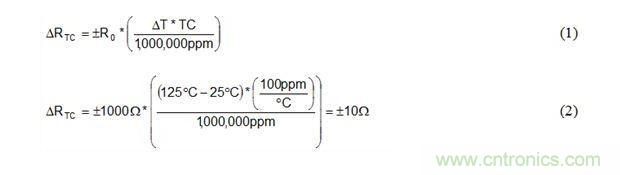 公式1和公式2是溫度從25°C到125°C變化時(shí),如何使用電阻器TC規(guī)范計(jì)算1kΩ、±100ppm/°C電阻器阻值ΔRTC變化的實(shí)例。
