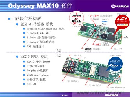 MAX 10 FPGA板卡以Altera的MAX10為核心,帶有30個(gè)插針的擴(kuò)展接口、紐扣電池接口、JTAG調(diào)試接口、各種開關(guān)/按鈕和8個(gè)LED。藍(lán)牙及傳感器板集成了一個(gè)藍(lán)牙4.0模塊、一個(gè)32位處理器、溫度/濕度傳感器、紫外線/光敏/距離傳感器和加速度傳感器。