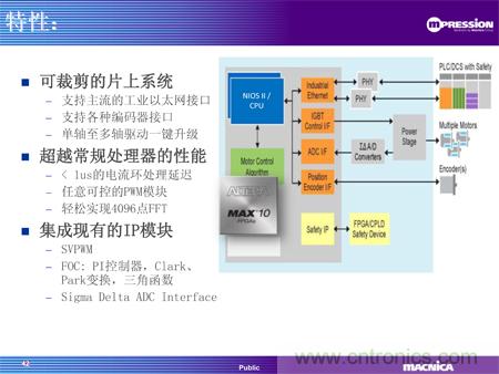 同期推出的還有駿龍科技基于MAX® 10 FPGA的電機(jī)驅(qū)動(dòng)方案,通過FPGA實(shí)現(xiàn)馬達(dá)控制的算法核心,提供了高性能、定制化和單芯片的解決方案,為馬達(dá)控制帶來革命性的質(zhì)的飛躍。使用FPGA 替代傳統(tǒng)的CPU/DSP架構(gòu)實(shí)現(xiàn)算法,意味著所有的算法都將通過硬件實(shí)現(xiàn),這樣由于處理能力限制而在CPU中無法實(shí)現(xiàn)的算法,現(xiàn)在都可以在MAX® 10 FPGA中以輕松地實(shí)現(xiàn)。Altera的MAX 10支持EtherCAT、Powerlink、Mechatrolink等工業(yè)以太網(wǎng)接口以及Endat 2.2, BISS等編碼器接口,用戶可以該方案中實(shí)現(xiàn)靈活可定制的接口。該方案還提供可定制的調(diào)試界面,客戶可以根據(jù)自己的需求,定制自己的調(diào)試界面,實(shí)時(shí)觀測內(nèi)部信號(hào)。