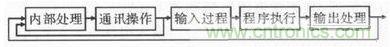 在延遲控制中,傳統(tǒng)的繼電器控制技術(shù)依靠設(shè)備的滯后性實(shí)現(xiàn),定時(shí)精度較差,在操作時(shí)不易調(diào)整時(shí)間。而PLC監(jiān)視控制是時(shí)鐘脈沖由晶體振蕩器引起的,可操控時(shí)間,且精度較高。PLC控制雖與微電腦技術(shù)相似,但工作方式卻不同。PLC技術(shù)采用循環(huán)掃描,而微機(jī)則采用鍵盤(pán)掃描,圖1是PLC技術(shù)的工作掃描方式。