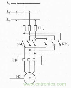 在眾多的操作系統(tǒng)中均要求電動(dòng)機(jī)能夠?qū)崿F(xiàn)正反轉(zhuǎn)給操作,從電動(dòng)機(jī)的工做原理中可知,需將三相電源中的任意兩個(gè)進(jìn)行對(duì)調(diào),就能實(shí)現(xiàn)電動(dòng)機(jī)的反向運(yùn)轉(zhuǎn),因此電動(dòng)機(jī)實(shí)現(xiàn)正反轉(zhuǎn)的實(shí)質(zhì)便是電源進(jìn)線的調(diào)換。但若僅調(diào)換進(jìn)線,容易導(dǎo)致電源短路,因此必須設(shè)置互鎖,圖2是三相異步電動(dòng)機(jī)正反轉(zhuǎn)的原理設(shè)計(jì)圖,圖中KM1和KM2均是交流接觸器主觸頭,當(dāng)KM1吸合時(shí),KM2交流接觸器主觸頭就會(huì)斷開(kāi),然后便可實(shí)現(xiàn)電機(jī)的正轉(zhuǎn)。若是斷開(kāi)交流接觸器主觸頭KM1,KM2就會(huì)吸合,此時(shí)電動(dòng)機(jī)則會(huì)實(shí)現(xiàn)反轉(zhuǎn),圖中的FU1主要用于防止電源短路,圓形代表電機(jī)M。