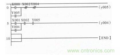 在圖3梯形圖中,PLC外部按鈕所控制的常開(kāi)觸點(diǎn)主要是左母線的第一等級(jí)以及第二等級(jí)的X001觸點(diǎn)和X002觸點(diǎn),只需按鈕便可使得X000或X001任意一個(gè)常開(kāi)觸點(diǎn)閉合,輸出繼電器Y005或繼電器Y004就能通過(guò)相應(yīng)線路形成閉合回路,進(jìn)而使常開(kāi)接觸點(diǎn)Y005或Y004實(shí)現(xiàn)自鎖功能同時(shí)實(shí)現(xiàn)電動(dòng)機(jī)的正反轉(zhuǎn)。停止通過(guò)PLC外部的按鈕實(shí)現(xiàn),按鈕通過(guò)釋放X002常開(kāi)接觸點(diǎn),使得繼電器斷電引發(fā)電動(dòng)機(jī)停止運(yùn)轉(zhuǎn)。