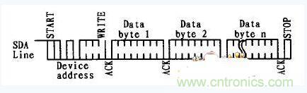 如果主設(shè)備要向EEPROM中寫數(shù)據(jù),在地址字節(jié)中主設(shè)備向EEPROM發(fā)出一個(gè)寫請求(R/W=0),發(fā)送的地址字節(jié)之后緊跟著要發(fā)送的數(shù)據(jù)。每發(fā)送一個(gè)字節(jié)的數(shù)據(jù)后EEPROM就會(huì)產(chǎn)生一個(gè)應(yīng)答信號,主設(shè)備也會(huì)監(jiān)控應(yīng)答信號,如果在發(fā)送一個(gè)字節(jié)后EEPROM沒有返回應(yīng)答信號,則主設(shè)備就會(huì)停止發(fā)送,并生成一個(gè)結(jié)束信號。寫操作的時(shí)序如圖3所示。