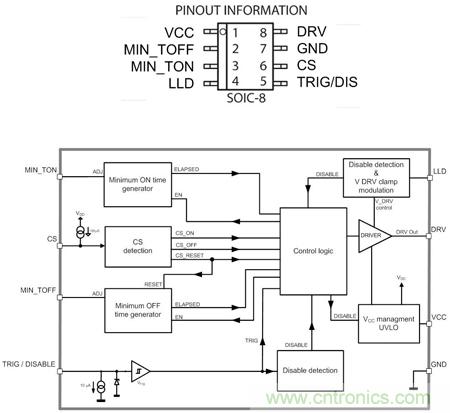 NCP4305可采用SOIC-8、DFN8和WDFN8三種封裝。MIN_TOFF 和MIN_TON引腳通過連接電阻到地,調節(jié)最小關斷和最小導通時間。LLD引腳用于在輕載時調節(jié)驅動器鉗位電平,或關斷驅動器。DRV引腳是同步整流MOSFET的驅動器輸出。CS(電流采樣檢測)引腳用于檢測電流是否流過同步整流MOSFET。TRIG/DIS引腳提供超快關斷輸入,用作在CCM應用中關斷同步整流MOSFET以提升能效,當上拉超過100 us時激活禁用模式。