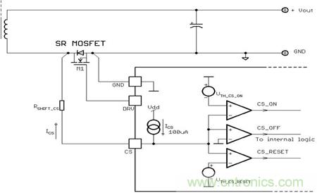 CS_OFF比較器是非常精密的真正的零比較器,通過同步整流將系統(tǒng)能效提升至最高。NCP4305的CS腳和SR MOSFET(M1) 之間的電阻用來調節(jié)關斷電流。當CS腳電壓低于VTH_CS _ON閾值時,M1 導通;當CS腳電壓高于VTH_CS _OFF閾值時,M1關斷。