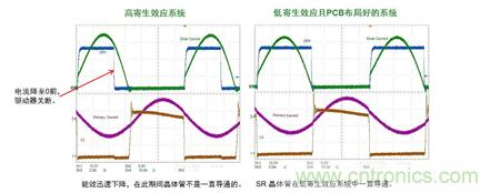 在CCM應用中,當初級端MOS管導通時,通過隔離驅動器強制使次級端MOS管關斷;當初級端MOS管關斷, TRIG腳功能使次級端MOS管導通。這種交替導通特性大大提高系統(tǒng)能效。如圖5所示,無觸發(fā)功能的初級端和次級端驅動信號交疊的時間為40 ns,遠大于帶觸發(fā)功能的12 ns,也就是說,觸發(fā)功能將縮短延遲時間,從而降低損耗。