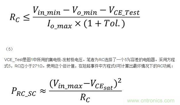 電阻器RC將會滿足輸出調(diào)節(jié)要求,并能在短路事件中耗散功率。筆者可計算出RC的值: