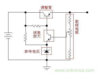 讓我們繼續(xù):如果我們用一個三極管或者場效應(yīng)管,來代替圖中的可變阻器,并通過檢測輸出電壓的大小,來控制這個“變阻器”阻值的大小,使輸出電壓保持恒定,這樣我們就實現(xiàn)了穩(wěn)壓的目的。這個三極管或者場效應(yīng)管是用來調(diào)整電壓輸出大小的,所以叫做調(diào)整管。