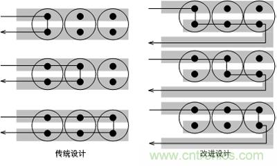 輸出濾波電容放置及走線對紋波噪聲至關重要,如圖1所示,傳統(tǒng)設計中由于到達每個電容的阻抗不一樣,所以高頻電流在三個電容中分配不均勻,改進設計中可以看出每個回路長度相當即高頻電流會均勻分配到每個電容中。