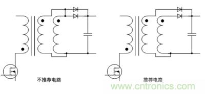 當電源輸出電流較大時,通常我們會采用兩個繞組并聯的方式進行使用,這兩個繞組通常分置于原邊繞組內外,所以直流阻抗會略有差異,從而有可能產生內部環(huán)流,電壓波形也會出現嚴重的振鈴,并且電磁干擾會變的更加嚴重,以及有可能會出現意外的大量發(fā)熱,如果輸出繞組一定需要并聯使用,最好采用如圖4的推薦電路,圖4推薦電路中二極管可以消除兩個不同繞組的不均勻導致的負面影響。