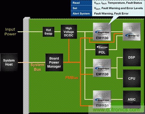(2)另一常見的系統(tǒng)電源要求是能夠進(jìn)行遠(yuǎn)程監(jiān)視,對電源各參數(shù)進(jìn)行實(shí)時(shí)監(jiān)視、故障報(bào)警和相應(yīng)調(diào)節(jié)。而最簡單、最便宜、最緊湊的方式是使用集成了遠(yuǎn)程監(jiān)視功能和相應(yīng)的通信總線的電源調(diào)節(jié)器。通過智能電壓ID(SmartVID)特性,Altera的Arria 10 FPGA和SoC通過PMBus接口,確定與Enpirion電壓調(diào)節(jié)器系統(tǒng)之間所需的VCC電壓和通信,將內(nèi)核電壓軌盡可能動(dòng)態(tài)調(diào)整到最小,而不會(huì)犧牲系統(tǒng)性能。同時(shí),支持PMBus的Enpirion的ED8101P0xQI單相數(shù)字控制器,與ET4040QI大電流電源配對使用,可實(shí)現(xiàn)對FPGA的多種遠(yuǎn)程監(jiān)視和低功耗特性。