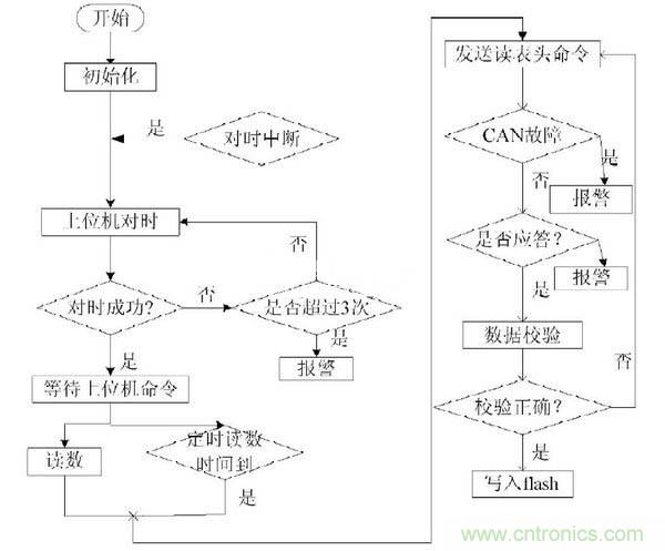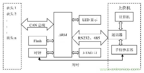 集中器通過(guò)CAN控制器發(fā)送讀表命令信號(hào)到總線上,每個(gè)表頭根據(jù)讀表命令將采集的信號(hào)通過(guò)CAN總線發(fā)送到集中器。集中器將采集的信號(hào)存儲(chǔ)在flash芯片中。上位機(jī)通過(guò)串口發(fā)送讀數(shù)據(jù)信號(hào)到集中器,集中器就把存儲(chǔ)在flash中的數(shù)據(jù)傳送給上位機(jī)。