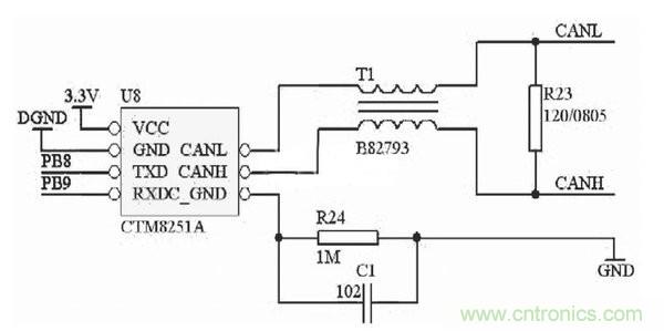 CAN-bus接口電路采用+3.3V供電,選擇CTM8251A隔離CAN收發(fā)器。該芯片是3.3V工業(yè)級(jí)的隔離CAN收發(fā)器。CTD0信號(hào)連接主控芯片的CAN控制器的發(fā)送腳,CRD0信號(hào)連接CAN控制器的接收腳。CTM隔離CAN收發(fā)器內(nèi)有一完整的CAN-bus隔離收發(fā)器電路,可以將來(lái)自CAN控制器的邏輯電平轉(zhuǎn)換為CAN總線信號(hào),并具有DC2500V隔離功能。另外,CTM收發(fā)器可以選擇集成ESD保護(hù)功能的“T”系列,從而省略外擴(kuò)的ESD保護(hù)器件。