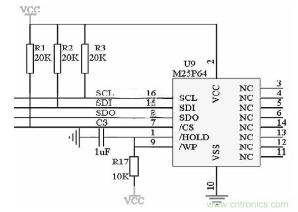 圖3為ARM與Flash的連接電路圖。以下幾點(diǎn)說(shuō)明:(1)SCL串行時(shí)鐘信號(hào),由主設(shè)備產(chǎn)生;(2)SDO主設(shè)備數(shù)據(jù)輸出,從設(shè)備數(shù)據(jù)輸入;(3)SDI主設(shè)備數(shù)據(jù)輸入,從設(shè)備數(shù)據(jù)輸出;(4)CS為片選,從設(shè)備使能信號(hào),由主設(shè)備控制。(5)對(duì)7、15、16角外接上拉電阻,提高芯片輸入信號(hào)的噪聲容限增強(qiáng)抗干擾能力。