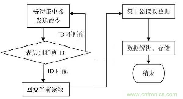 對(duì)時(shí)成功后,集中器繼續(xù)等待上位機(jī)的讀數(shù)命令或等待中斷讀數(shù)命令。當(dāng)收到讀數(shù)的命令后,定時(shí)讀數(shù)使集中器按設(shè)置的時(shí)間,自動(dòng)讀取表頭采集來(lái)的數(shù)據(jù);讀數(shù)使集中器讀取當(dāng)前表頭的數(shù)據(jù)。