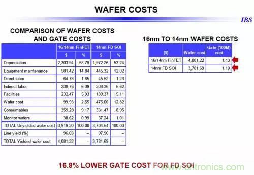 IBS 首席執(zhí)行官Handel Jones則比較了16/14納米FinFET與14納米FD SOI的晶圓成本與單位晶體管成本,根據(jù)他的計算,14納米FD-SOI工藝單位晶體管成本比相應的FinFET工藝低了近17%。