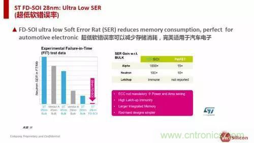 除了低功耗與低成本,F(xiàn)D-SOI工藝在可靠性上也表現(xiàn)出色。沈磊指出,從意法半導體給出的數(shù)據(jù)來看,由于FD-SOI工藝的敏感體積更小,對閂鎖效應(latch-up)免疫,具備更低的SRAM軟錯誤率,以及更好的電磁兼容性,使其更適用于高可靠應用領域,例如汽車、銀行與生命維持系統(tǒng)等。