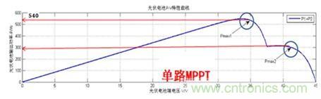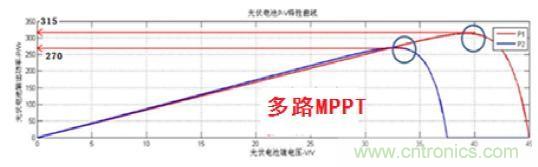 因為光伏電池陣列是單位光伏電池組串組成的,每個組串都有自己的工作電壓,電壓很大概率上不一致,如果以傳統(tǒng)的集中式方案的話,組串在匯流箱能量匯集時并聯(lián)會發(fā)生一次并聯(lián)失配,匯流箱到逆變器能量并聯(lián)時再發(fā)生一次并聯(lián)失配,嚴重影響光伏電池組件的發(fā)電效率。如下圖3所示,單路MPPT的情況下,光伏電池組件受到各種因素的影響,會導(dǎo)致出現(xiàn)兩個或多個波峰的情況,跟蹤到任何一個波峰都會對發(fā)電量造成損失。而如果多路MPPT的情況下,能精確跟蹤到每一個組串的特性,形成多條MPPT曲線,使得每串光伏電池組串最大效能的發(fā)揮作用。