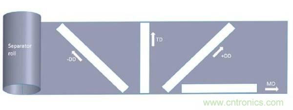 具體實驗過程如下,首先將參與測試的隔膜材料根據(jù)ASTM針對薄膜材料的D882規(guī)范的要求,制成了具有規(guī)則形狀的長條形試樣,拉伸實驗采用Instron 5944單向拉力機進行測試,拉力加載速度為25mm/min。測試結果發(fā)現(xiàn),干法工藝制備的PE隔膜和三層復合隔膜在各個方向的抗拉強度上有很大的差距,例如在縱向MD上,抗拉強度>120MPa,在橫向TD和對角線方向上僅>20MPa。而濕法工藝制備的隔膜在各個方向上具有相似的抗拉強度(>140MPa),而無紡布工藝制備的隔膜的抗拉強度最差(<35MPa),無紡布隔膜在縱向和橫向具有相似的強度,但是對角線方向抗拉強度要明顯弱很多。