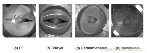 穿刺強度實驗發(fā)現(xiàn),干法工藝制備的PE隔膜和三層復合隔膜會在沿著縱向的方向上出現(xiàn)一個較長的裂縫,而對于濕法工藝和無紡布工藝隔膜,失效多數(shù)只出現(xiàn)在局部,并且呈現(xiàn)圓形破口。