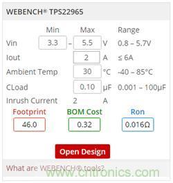 負載開關(guān)WEBENCH功能可通過產(chǎn)品頁面右側(cè)的WEBENCH組件實現(xiàn)。圖2顯示了TPS22965負載開關(guān)的組件。