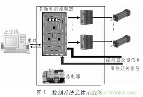 多軸控制器與上位機(jī)、電機(jī)驅(qū)動(dòng)器等配合使用,圖1為采用多軸控制器組成的控制系統(tǒng)總體示意圖。控制器接收上位機(jī)發(fā)送的控制指令,分析處理并產(chǎn)生相應(yīng)的方向信號(hào)、脈沖信號(hào)給驅(qū)動(dòng)器,從而達(dá)到控制電機(jī)運(yùn)行的目的。為了提高系統(tǒng)的控制精度,將電機(jī)的編碼器信號(hào)作為反饋信號(hào)輸入給控制器(內(nèi)部實(shí)現(xiàn)自動(dòng)辨向及四細(xì)分)。在各軸運(yùn)動(dòng)過(guò)程中,專(zhuān)用控制器對(duì)電機(jī)運(yùn)行的絕對(duì)位移進(jìn)行記錄,并且可以實(shí)時(shí)地將各軸的絕對(duì)位置信息上傳給上位機(jī)。另外在電機(jī)運(yùn)行的過(guò)程中,為了保證電機(jī)運(yùn)行的安全性,控制器還采用了限位信號(hào)反饋實(shí)現(xiàn)全硬件保護(hù)措施。