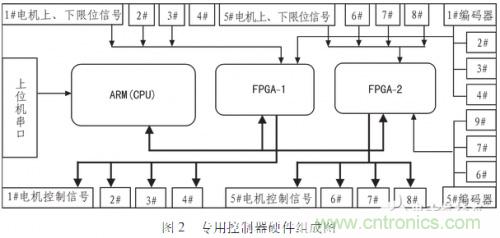專(zhuān)用控制器由arm(LPC2214)、fpga(EP2C5T144C8)、驅(qū)動(dòng)器接口電路、編碼器接口電路、限位檢測(cè)電路和電源電路等組成,如圖2為一個(gè)八軸電機(jī)控制器的硬件組成圖。arm通過(guò)串口實(shí)現(xiàn)與上位機(jī)之間的通信,解析從上位機(jī)獲得的控制指令,并通過(guò)fpga產(chǎn)生相應(yīng)輸出信號(hào)給驅(qū)動(dòng)器接口,驅(qū)動(dòng)器接口外接驅(qū)動(dòng)器。編碼器信號(hào)作為位置反饋信號(hào)同編碼器接口相連,形成位置環(huán)反饋。限位信號(hào)作為安全檢測(cè)信號(hào)同限位檢測(cè)接口相連,為整個(gè)系統(tǒng)添加一道安全保障。